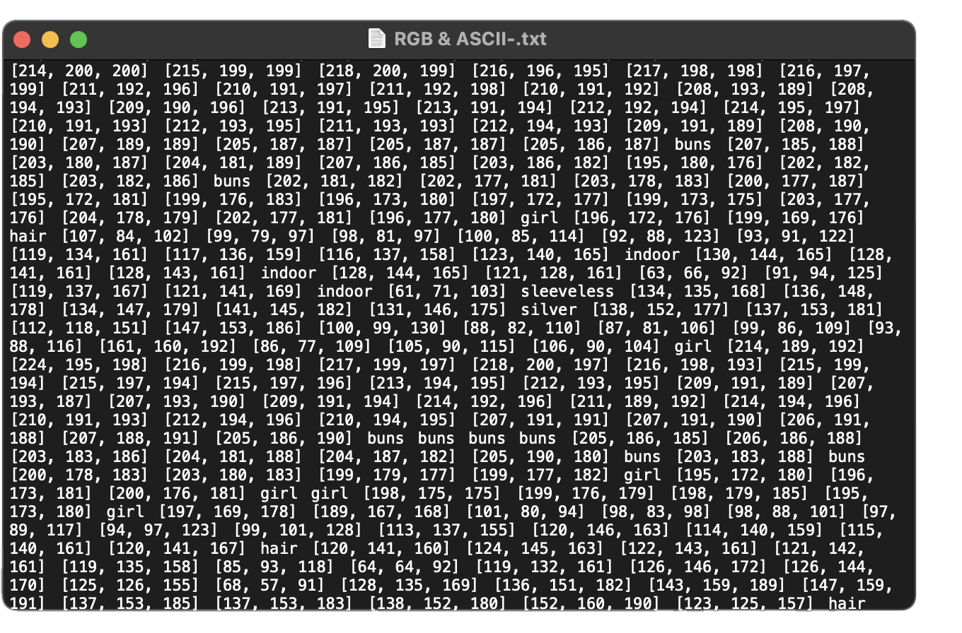 In one of my experiments, I encoded an image into its RGB pixel values as a way to quantify my own memories as the image. The pixel values are then manipulated with ASCII characters to create poems from numerical values. When any pixels from the RGB values match with the text given, it will replace the text with the numbers. These manipulated numbers and texts are then fed to ChatGPT to see how it reconstructs the image based on its "understanding.”